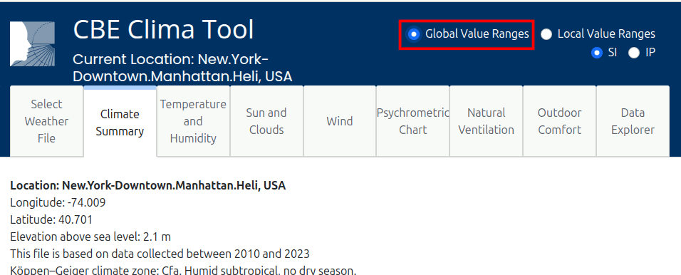 Go to the CBE clima tool. At the top right corner select ‘Global Value Ranges’. This make sure the scale of the graphs are adjusted for easy comparisons between different climates. If you are only interested in looking at a single climate with no comparison then you will choose the ‘Local Value Ranges’.