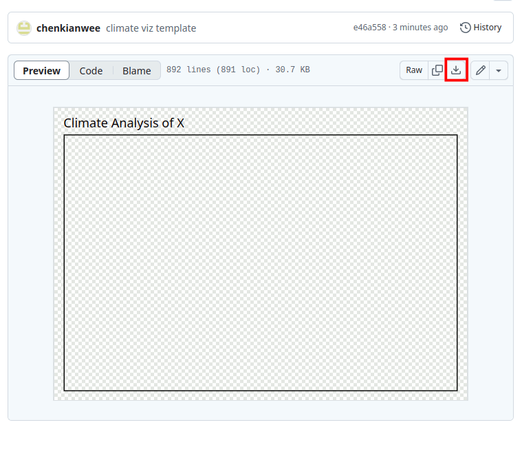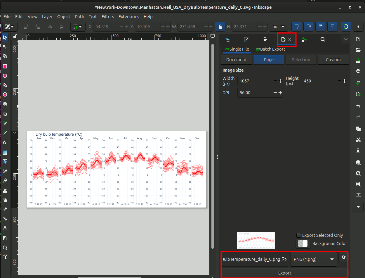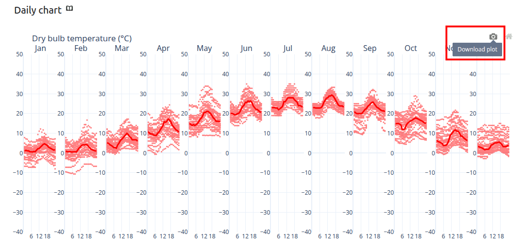 We will go to the Temperature and Humidity tab and download the Daily Chart for Dry Bulb Temperature. Hover on the graph and you will see two icons, click on the camera icon to download the graph as .svg file. Create a folder to hold all the graphs that you are going to download from the Clima tool.
