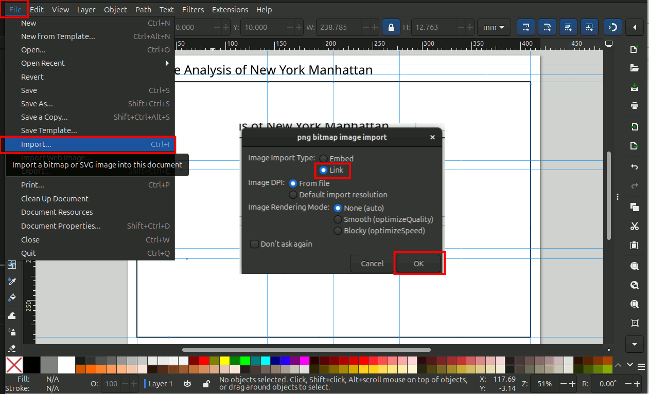 Import the png file from the previous step into the visualization template from the first section. In the import dialog choose the Image Import Type: Link. This means that if you make edits and save over the png files, it will automatically be reflected on the template. The image is not embedded onto the visualization .svg template. It also means if you move the .png image to another folder, it will break the link.