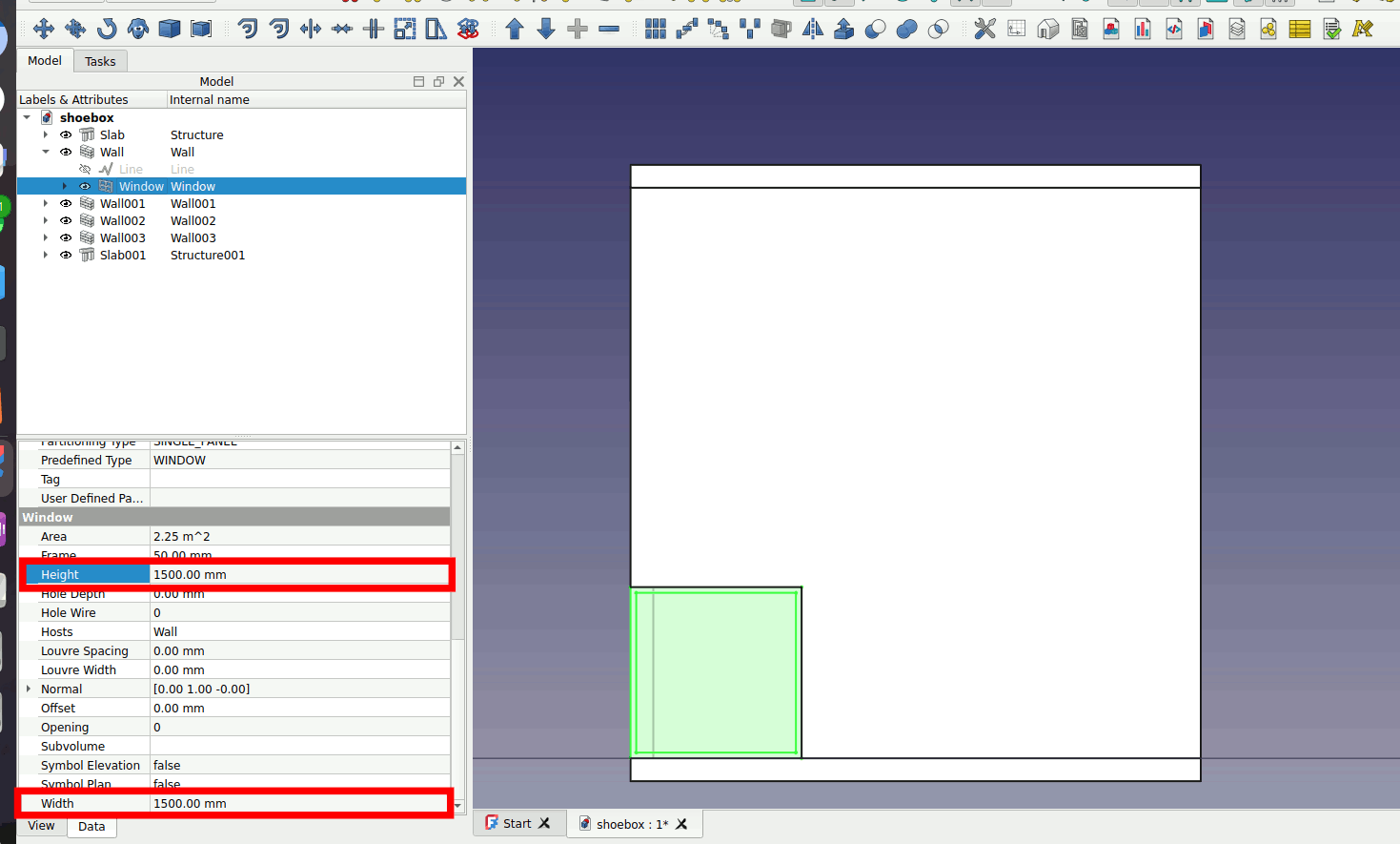Select the window and adjust the Height and Width of the window to 1500mm.