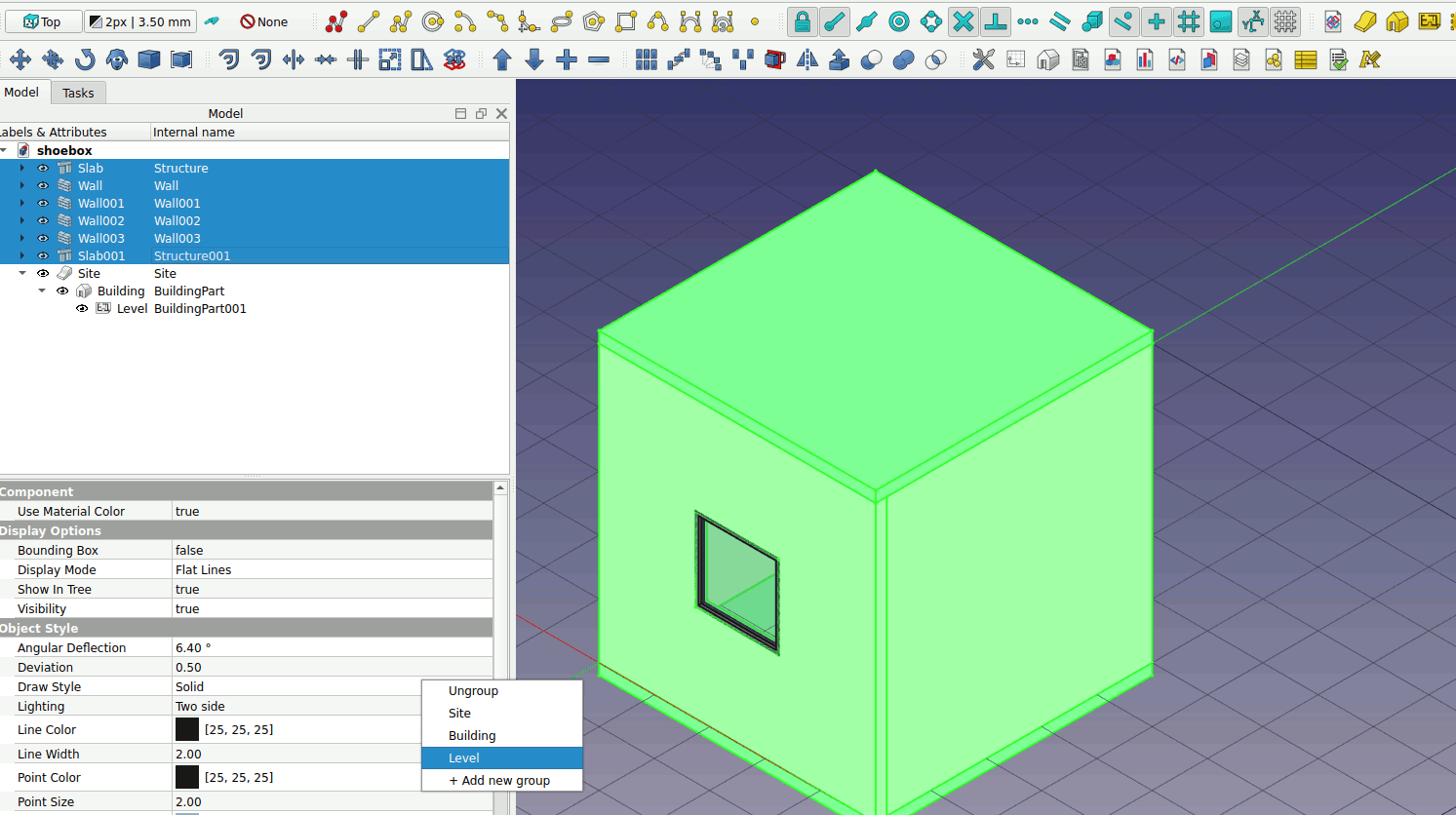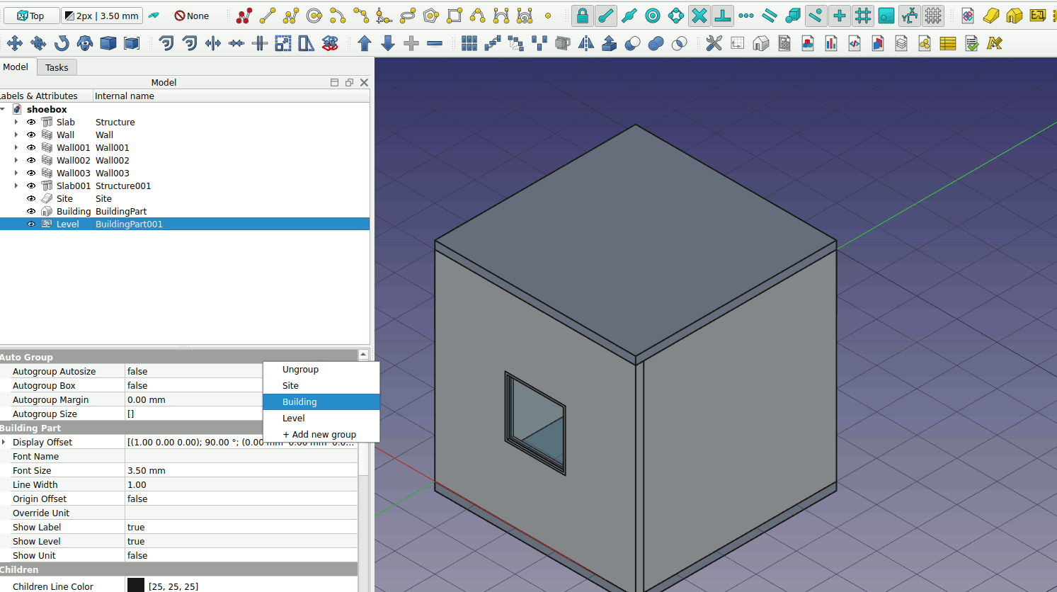 4. Select the slabs and walls by Shift + Left Click. Right click -> Move to group … Repeat the same procedure for moving the all the selected object into the Level object.
