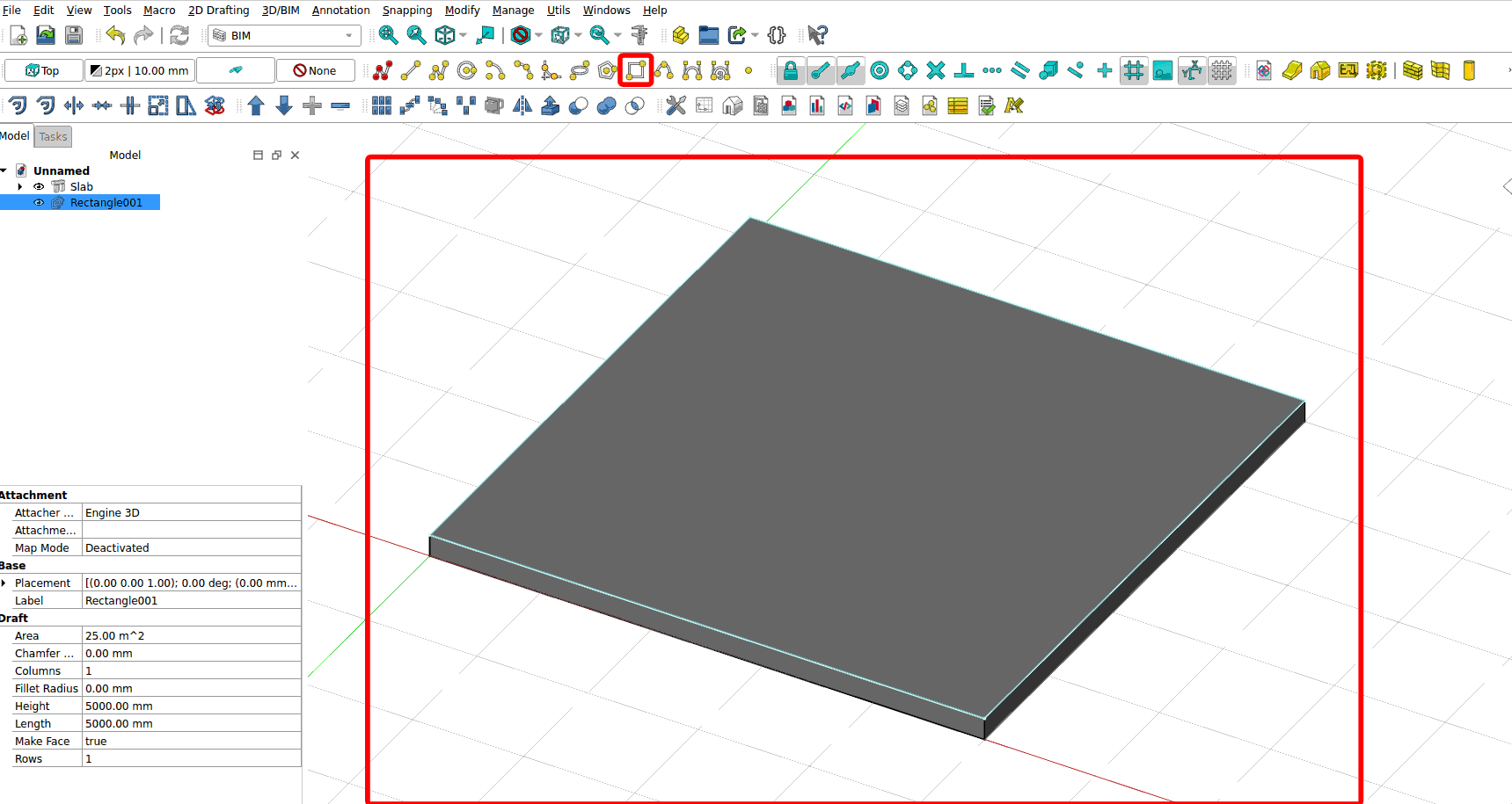Model a 5m x 5m x 5m box in FreeCAD. Create a floor slab that is 5m x 5m. Draw a rectangle that is 5m x 5m. Click on the Rectangle tool on the BIM workbench (highlighted in red box below). Draw a square.