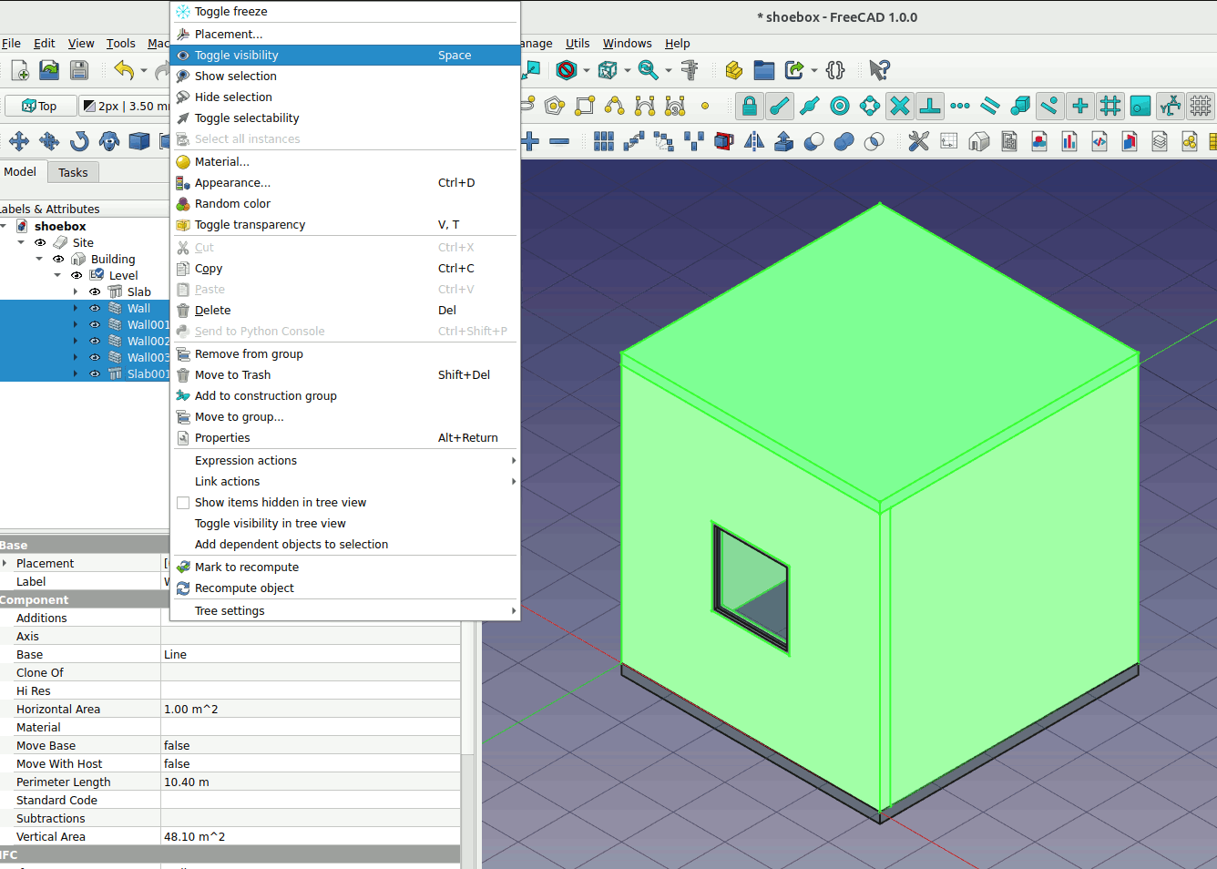 Next we will try to draw the thermal zone for the shoebox. First hide the walls and roof of the shoebox. Shift+select all the walls and the slab as shown in the image below. Right click -> Toggle visibility. You can also use the keyboard shortcut key Space to turn on/off the visibility.