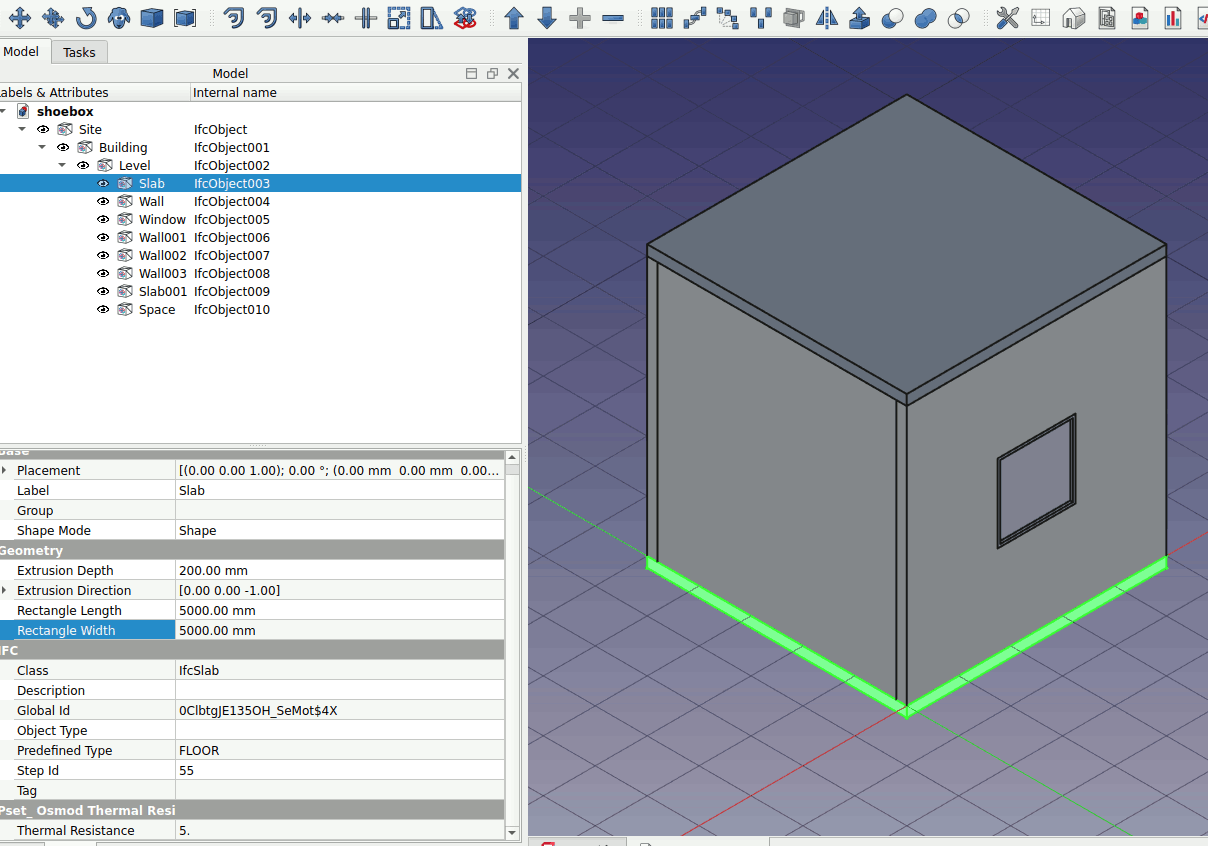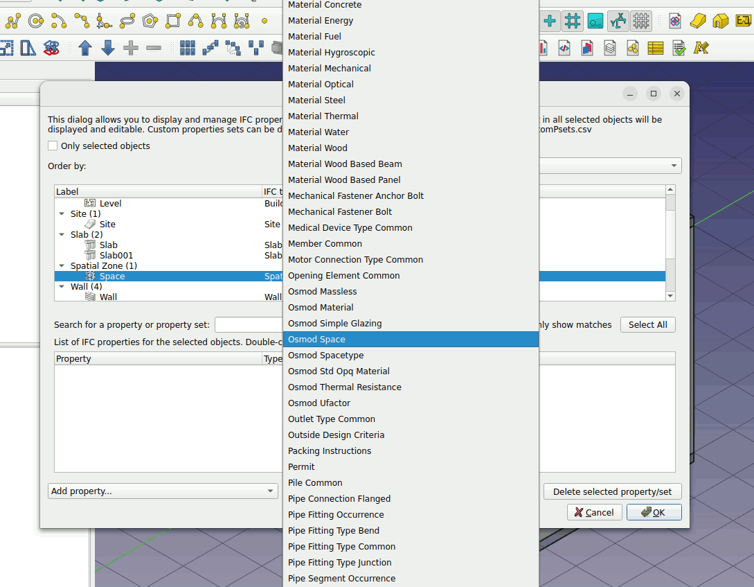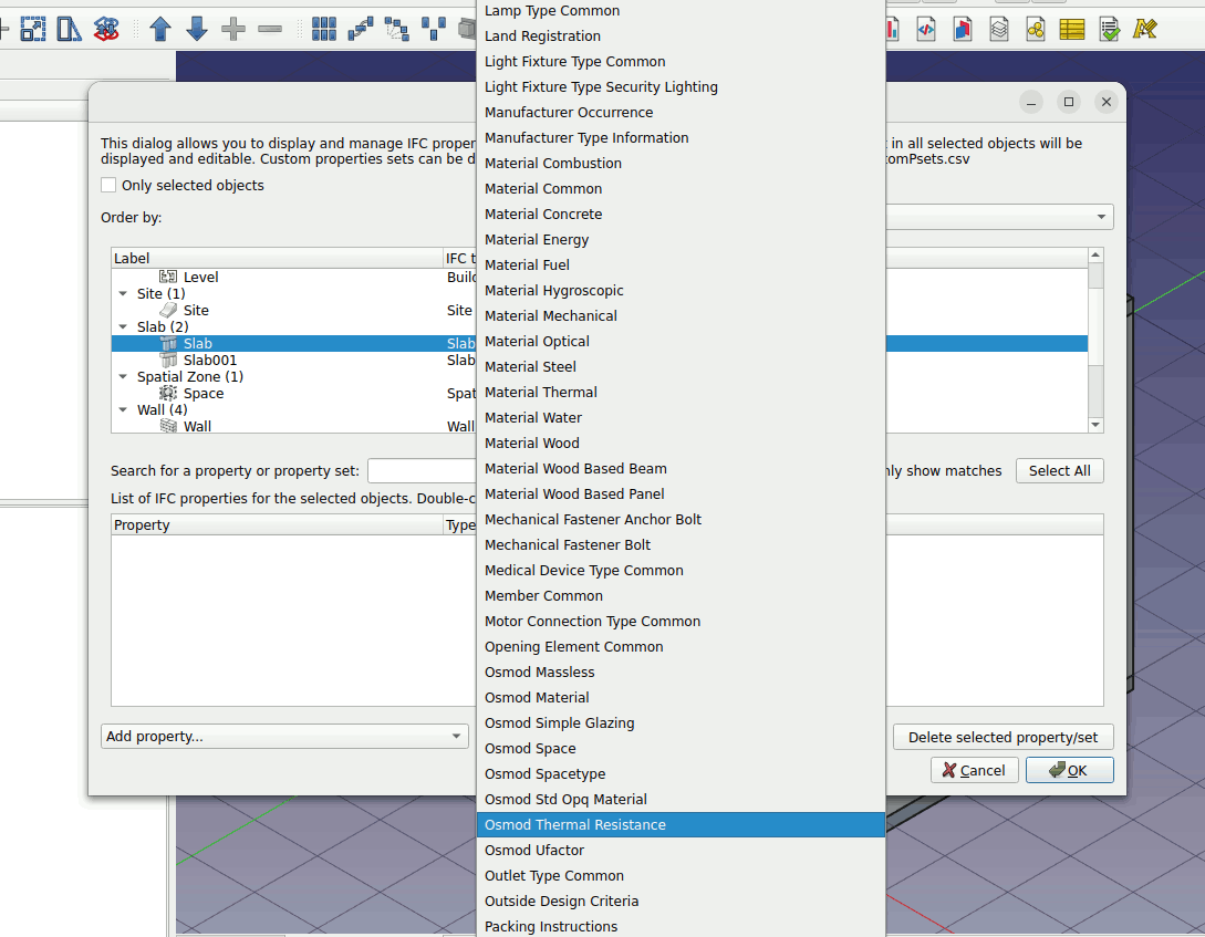 3. Select the slab object. Left click on the Add property set… parameter. Press O on the keyboard and choose ‘Osmod Thermal Resistance’. Do this for the roof, floor and walls.