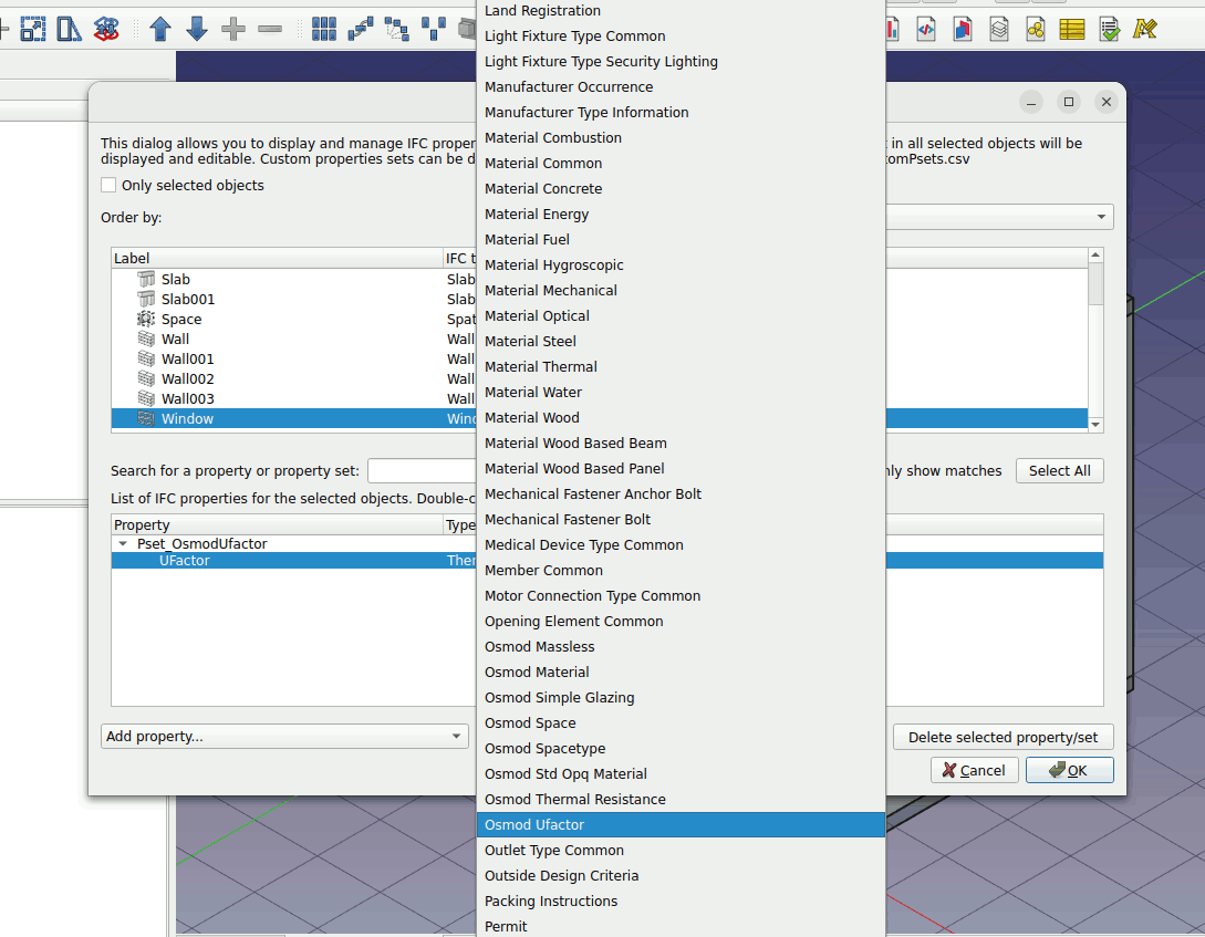 Select the window object. Left click on the Add property set… parameter. Press O on the keyboard and choose ‘Osmod Ufactor’.