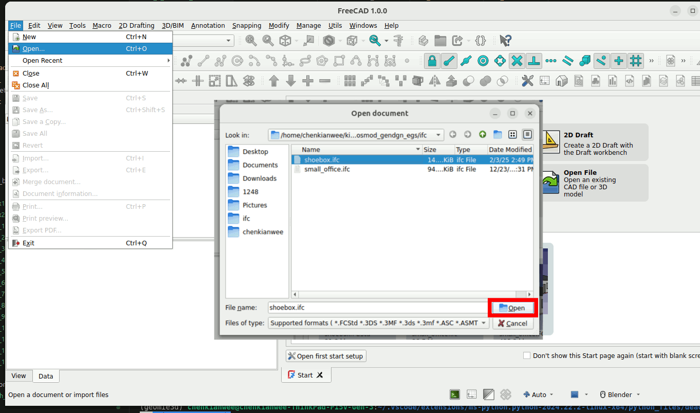 2. Check the exported file by opening it in FreeCAD again. Go to File -> Open