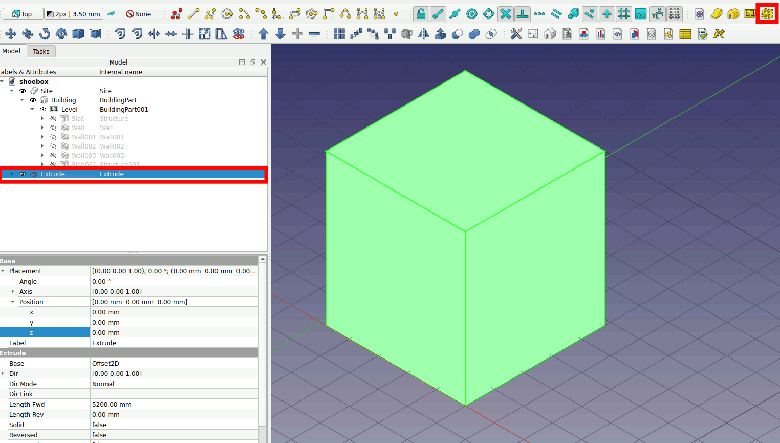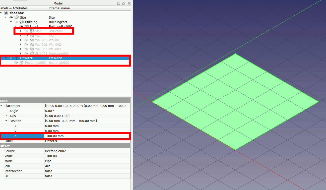 3. Select the floor slab and toggle visibility (press space to toggle visibility). Click on the arrow on the offset2d and also toggle visibility of Rectangle002. Select Offset2d and adjust the z position to -100mm. The floor slab like the wall slab is also 200mm thick. For the zone to be in the centerline you need the z-position to be -100mm.