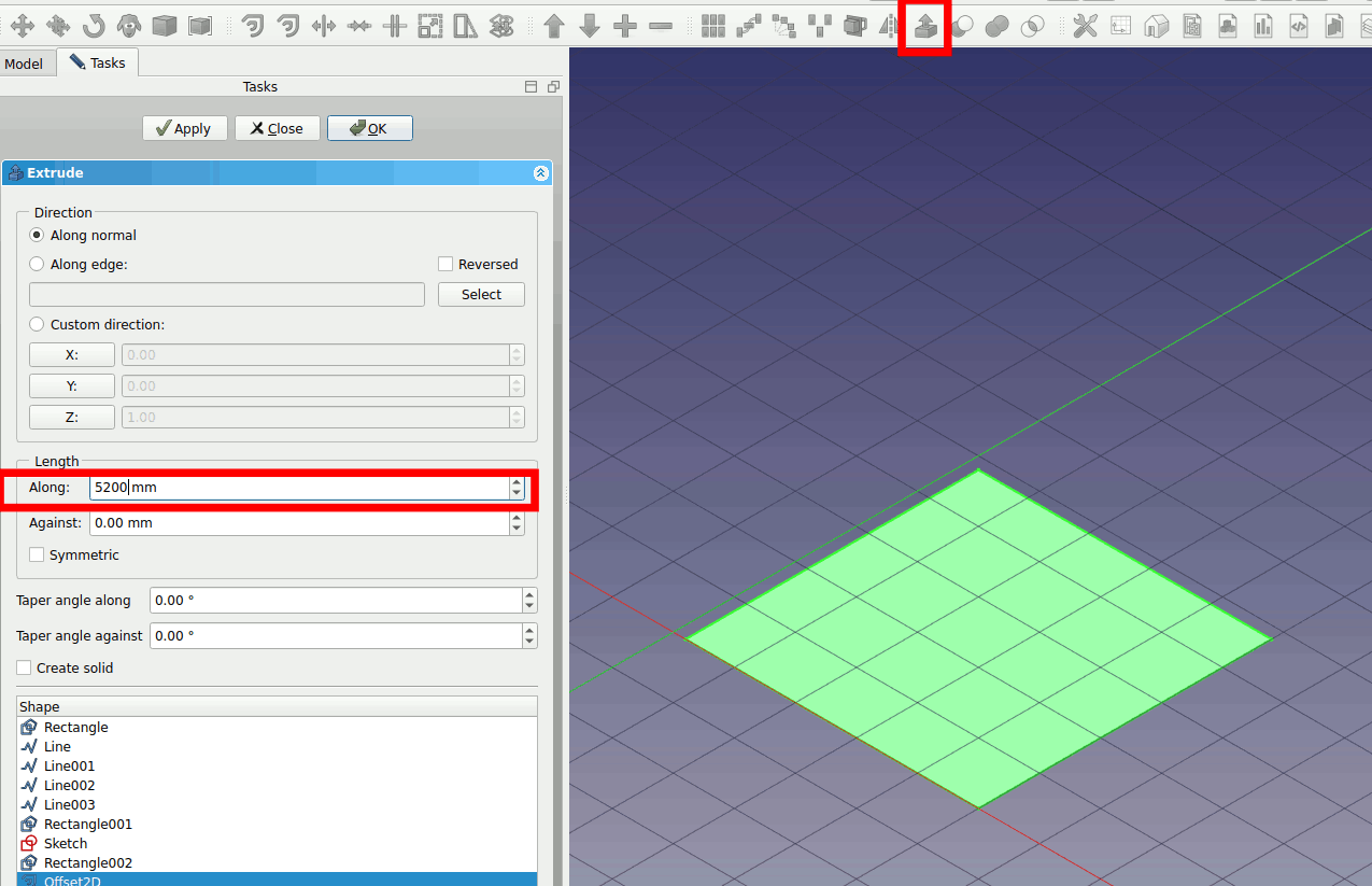 4. Select the Offset2D and click extrude. Extrude along 5200mm and click on OK.