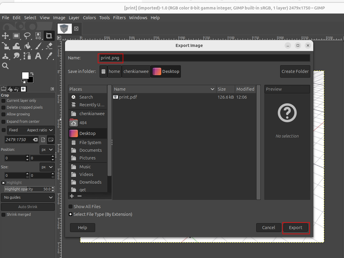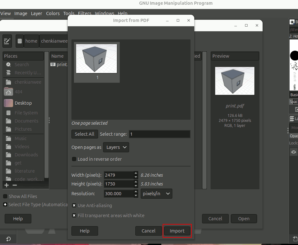 For some reason, Inkscape is not able to import the pdf exported by FreeCAD. We have to convert the pdf to png. Here I will be using Gimp to do the conversion. In Gimp, go to File -> Open and choose the exported pdf file. A Import from PDF window will pop up. Just click Import.