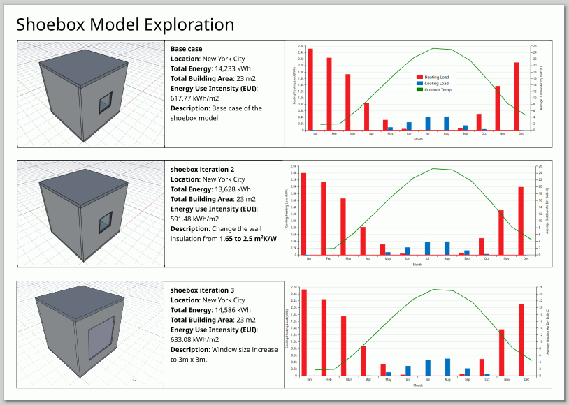 Congratulations!! You have successfully Model, Simulate and Visualize the shoebox model. Complete the template by varying design parameters like bigger window to wall ratio, thermal resistance and window u-value. So you can see how design parameters change HVAC performance.