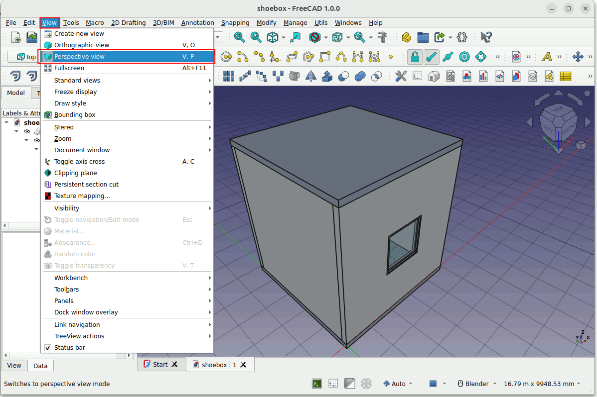 We want to add an image of the iteration to the template. We can grab an image by going back to the FreeCAD model. In FreeCAD, Go to View -> Perspective View. Adjust the view accordingly.