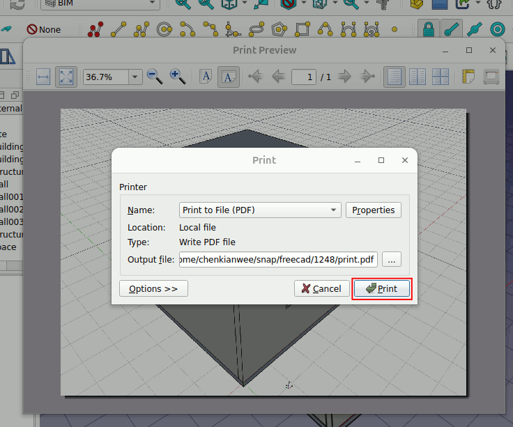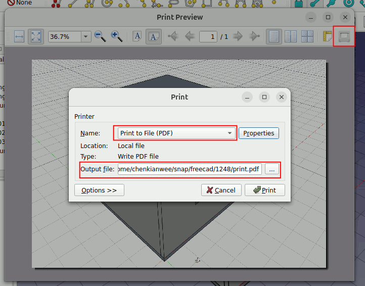 At the Print preview window click on the Print icon as shown below. The print window will pop up. Make sure to change the Name -> Print to File (PDF). You can specify the directory of the output file.