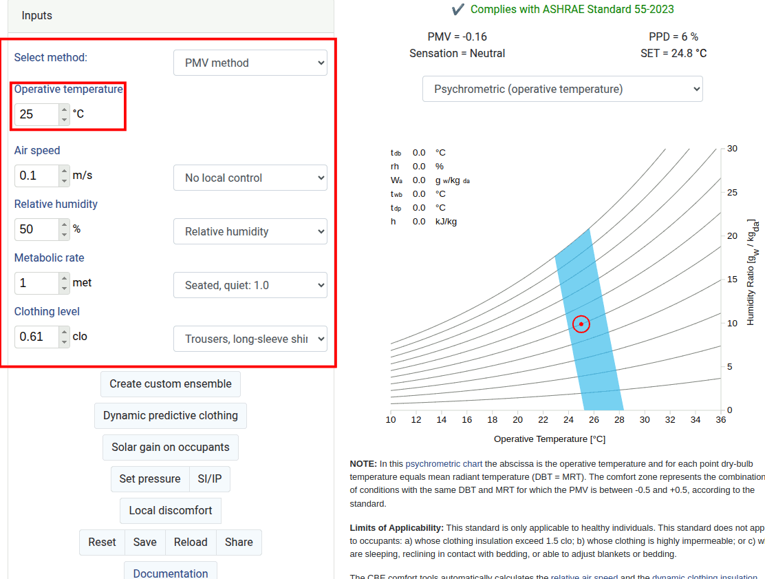 We will use the ASHRAE-55 Predicted Mean Vote (PMV) method for this tutorial. On the left bar you only see 5 factors: Operative temperature, Air speed, Relative humidity, Metabolic rate and clothing level. Air temperature and Mean Radiant Temperature (MRT) are missing and replaced by operative temperature. Operative temperature is a metric that combines both the air temperature and MRT, at its simplest form it is expressed as the average of air temperature and MRT. Read more about it on its wikipedia entry.