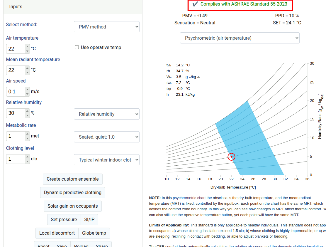 It complies with the ASHRAE Standard 55. For winter, based on the model an air temperature of 22 degC (71.6 degF) setpoint shld be sufficient to keep a person comfortable, if the other conditions as specified are met. The PMV vote is -0.49 (0 being neutral not hot and not cold) with Percentage of People Dissatisfied (PPD) = 10% that means 10% of the people in the room might be unsatisfied with the thermal condition.