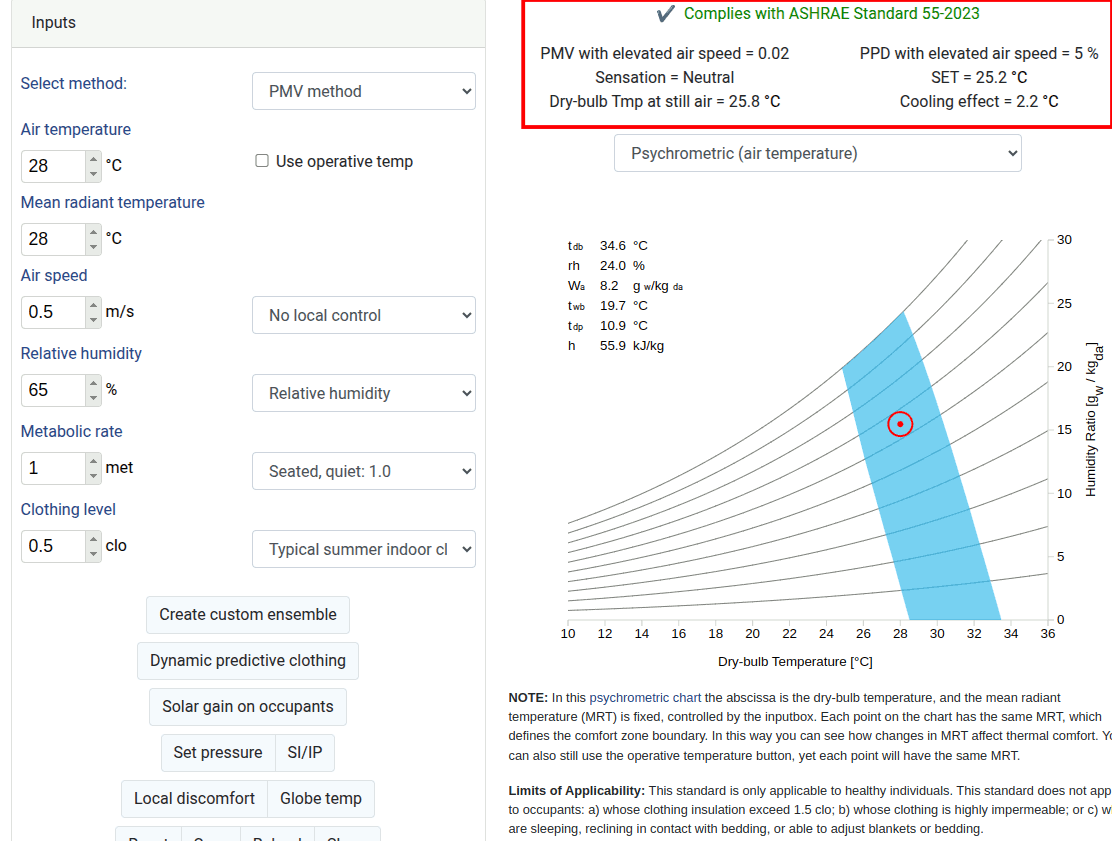 It complies with the ASHRAE Standard 55. For summer, based on the model an air temperature of 28 degC (82.4 degF) setpoint shld be sufficient to keep a person comfortable, if the other conditions as specified are met. The PMV vote is 0.02 with Percentage of People Dissatisfied (PPD) = 5%.