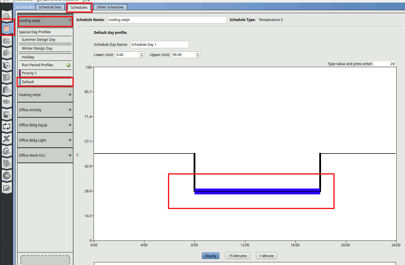From the thermal comfort model. A heating setpoint of 22degC and cooling setpoint of 28degC are sufficient for thermal comfort. Let’s edit the set point schedules accordingly. Open the shoebox.osm model and go to the schedules. Select the cooling setpoint and Default schedule. Change teh set point to 28 degC as shown in the image below.