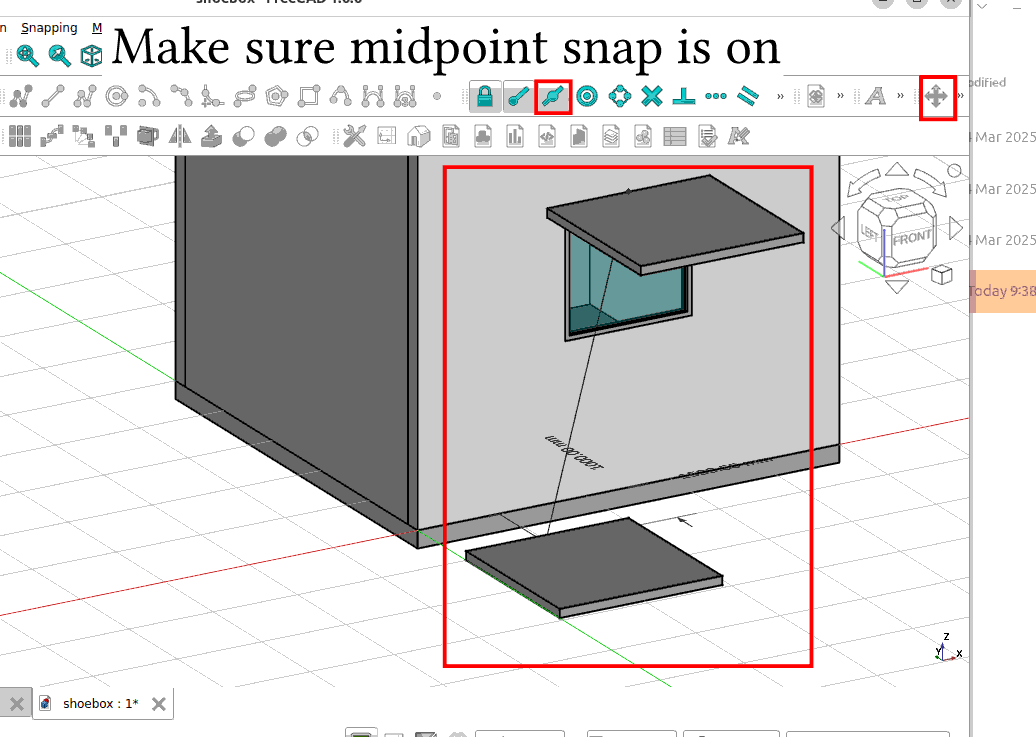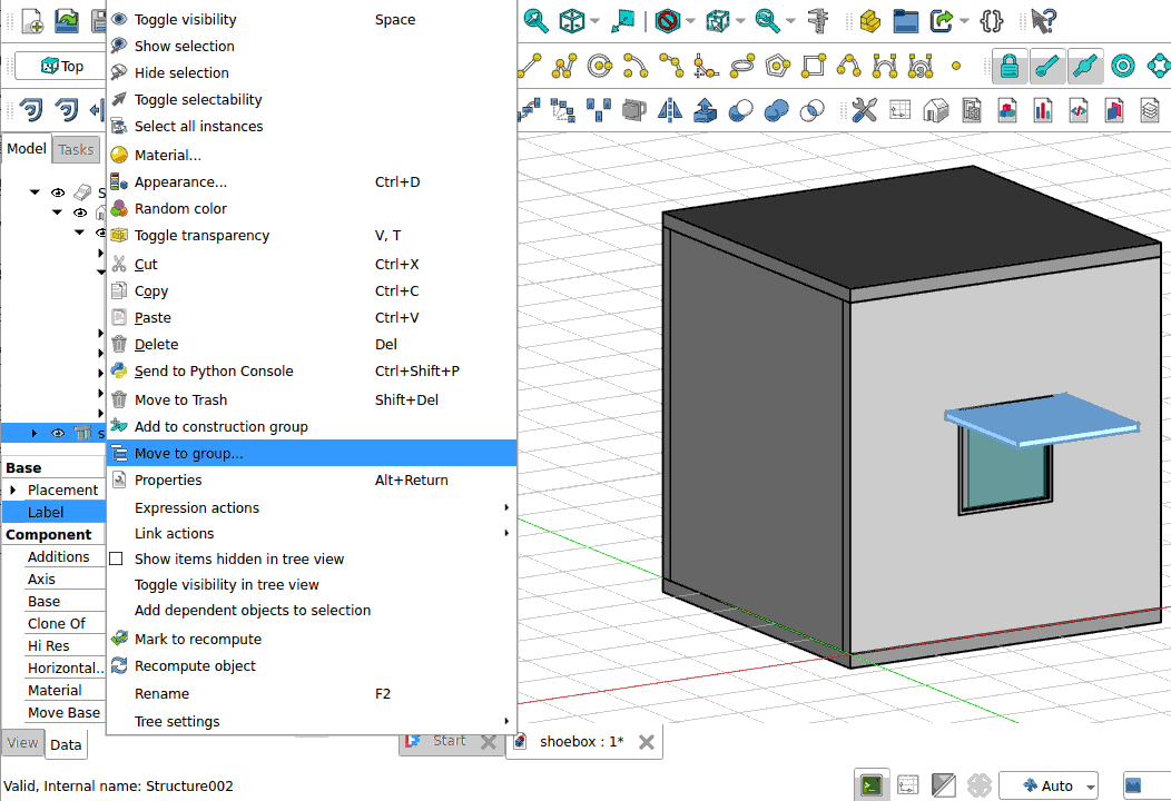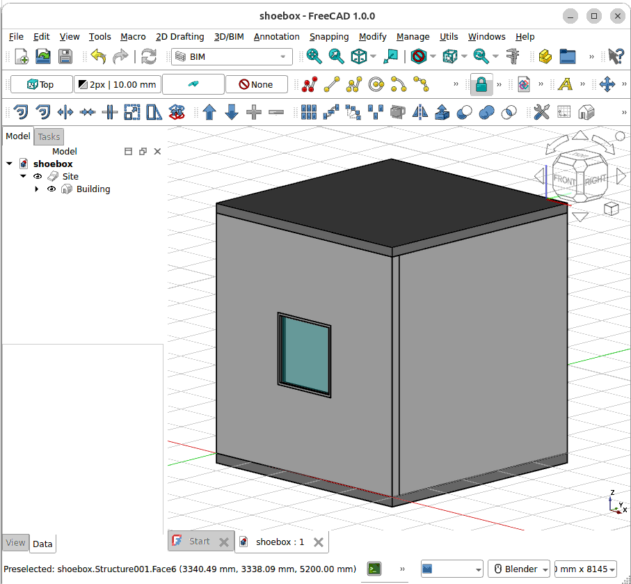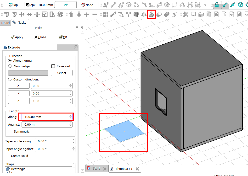In this tutorial we will be using the shoebox model that was constructed in the previous exercise. Open the FreeCAD shoebox.FCStd model.