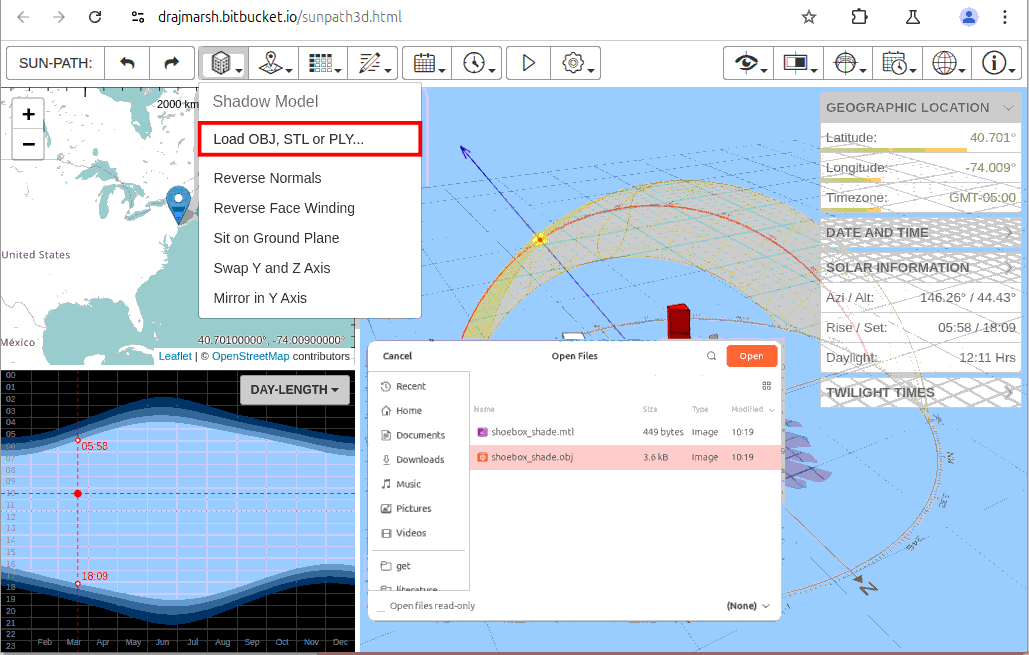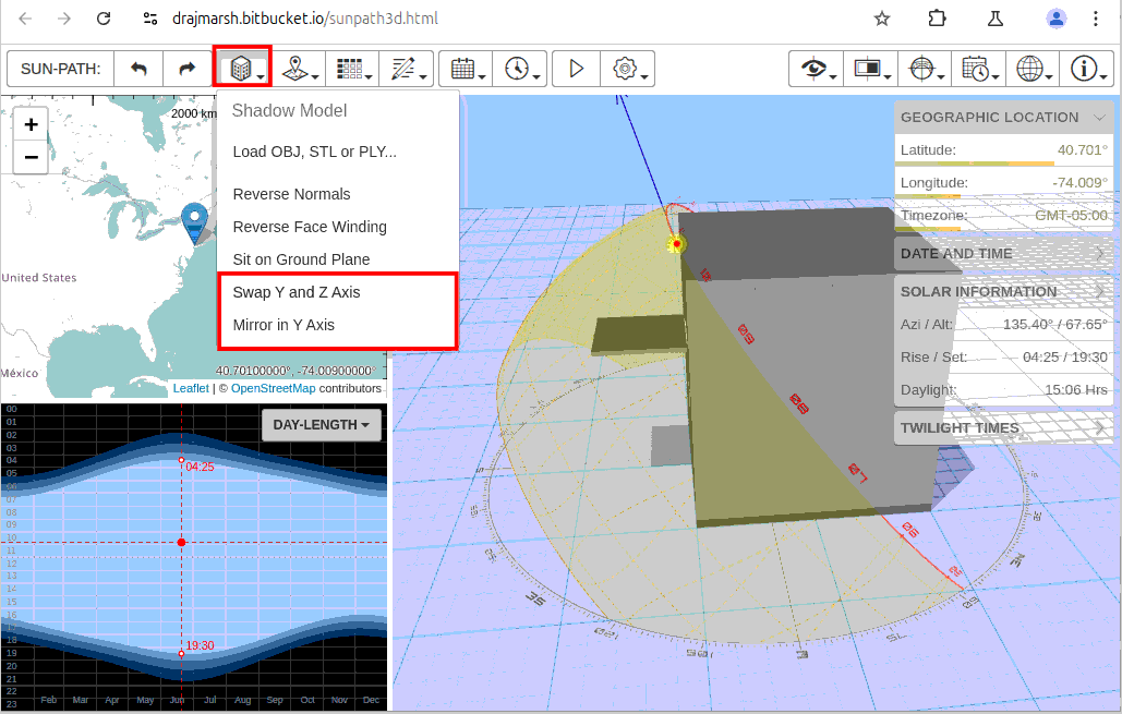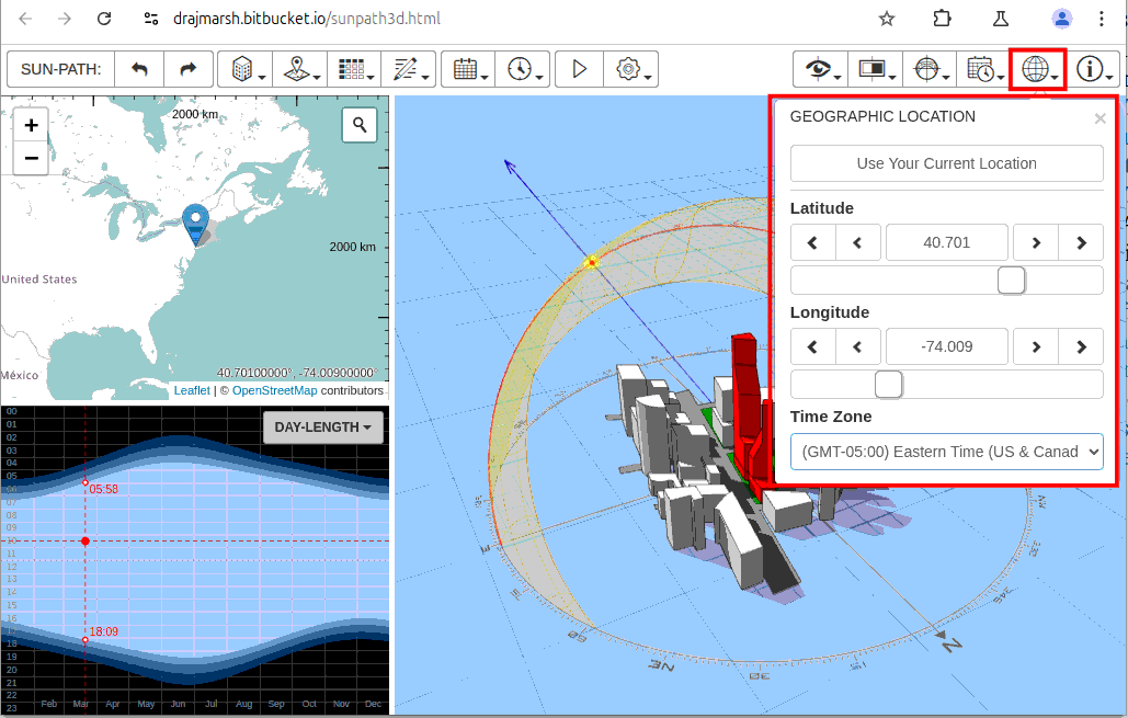 Go to the 3D sun path web app. Change your Geographic location to New York:
