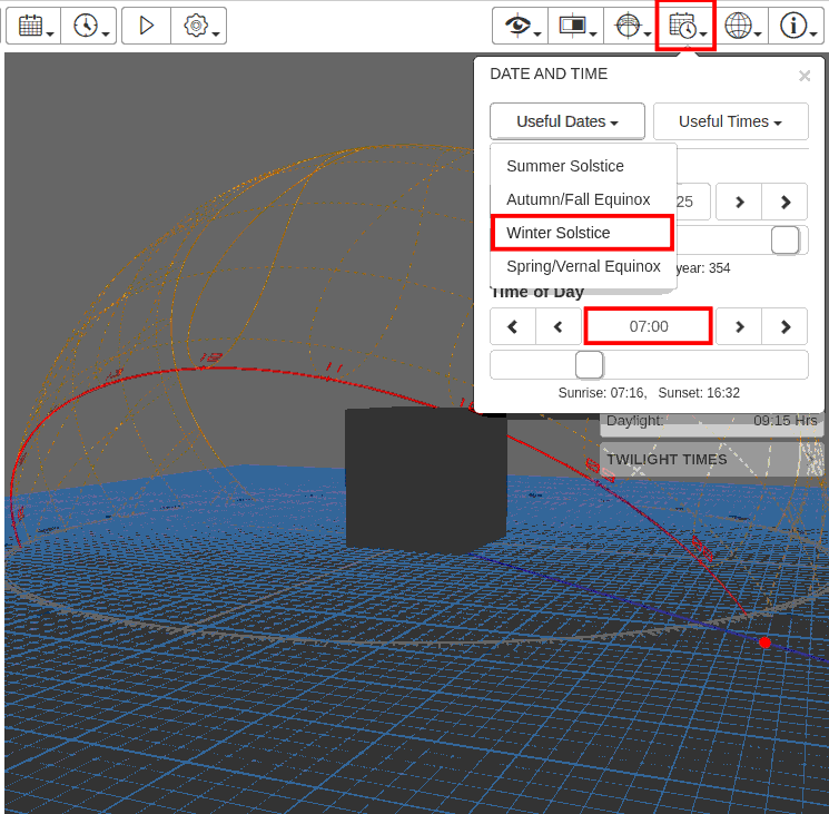 Go to Date/Time panel. Click on Useful Dates -> Winter Solstice. Click on Time of Day and enter 7.