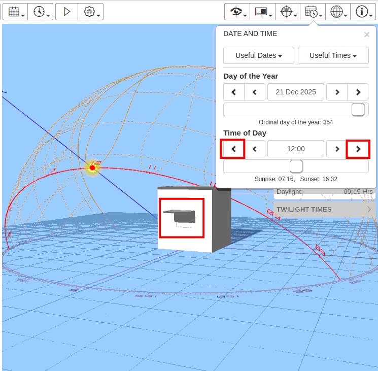 Cycle through the day by clicking on the outer arrow of the Time of Day parameter. The time will move in 30 mins with each click. You can see that at noon 12pm half of the window is shaded. This is not desireable as we want winter heating. The shading is too long.