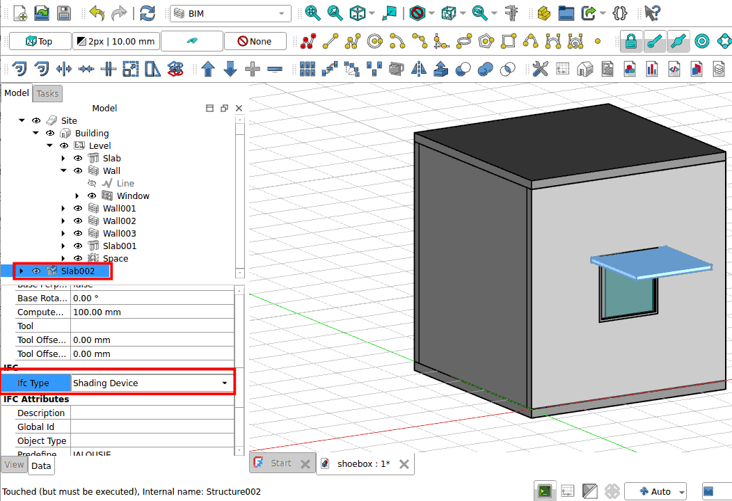 Select the slab object in the model window. In the Data tab, look for the Ifc Type parameter and change it to ‘Shading Device’.