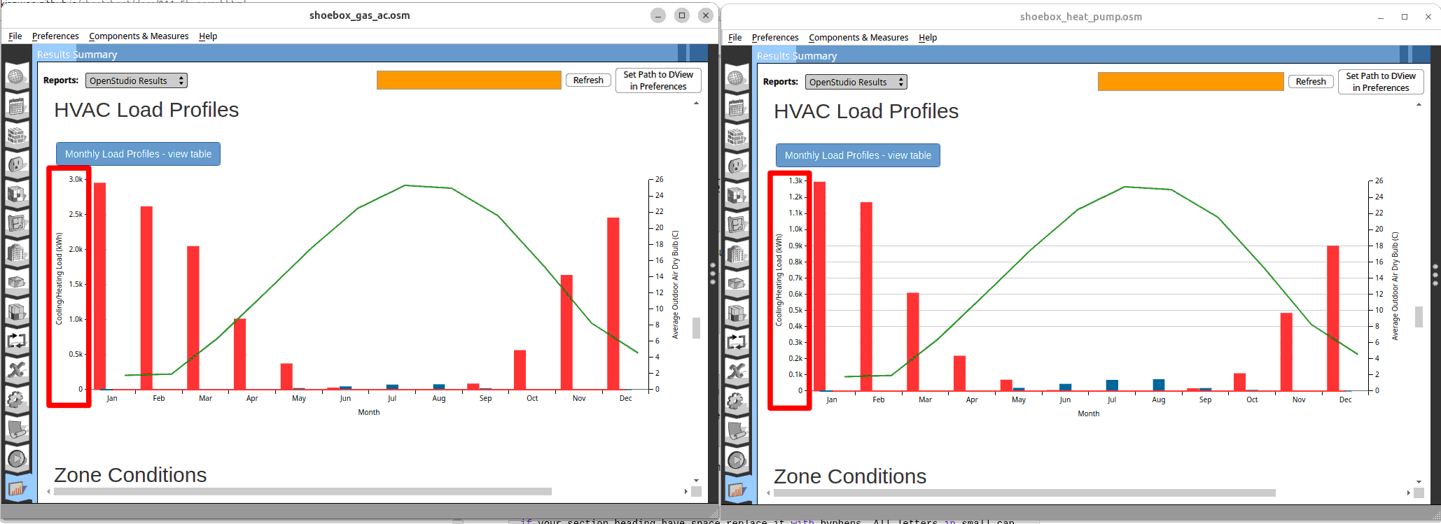 Open the baseline simulation and compare the two results side by side. You will realise ‘shoebox_gas_ac.osm’ uses more energy. You can also see that the cooling energy consumption is lower while the heating is higher. Why is that so?