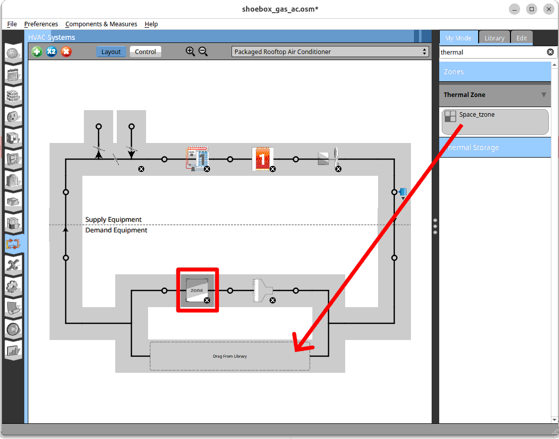 On the window on the right. Search for ‘thermal’. Drag and drop the ‘Space_tzone’ onto the Drag from library box on the HVAC network.